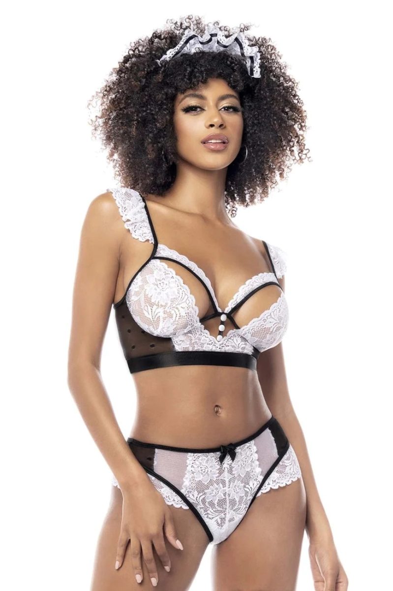 • Disfraz de sirvienta sexy. Incluye top de encaje y malla con tirantes ajustables con volantes, braguita a juego con espalda abierta y accesorio para la cabeza. Medias NO incluidas.