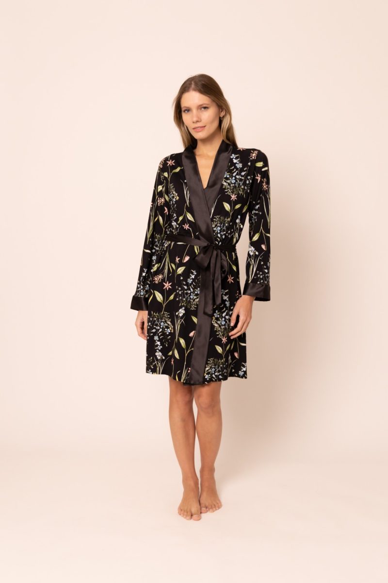 • Salida de cama refleja la delicadeza de las noches de la temporada, combinando un sofisticado fondo oscuro con follaje que aporta un toque de elegancia y frescura.