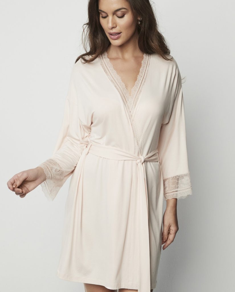 • Bata cruzada corta con lazo interior que ata a la cintura. Sus detalles de encaje en el escote y sus mangas la convierten en una prenda delicada y sofisticada a la que, además de encanto, no le falta carisma.