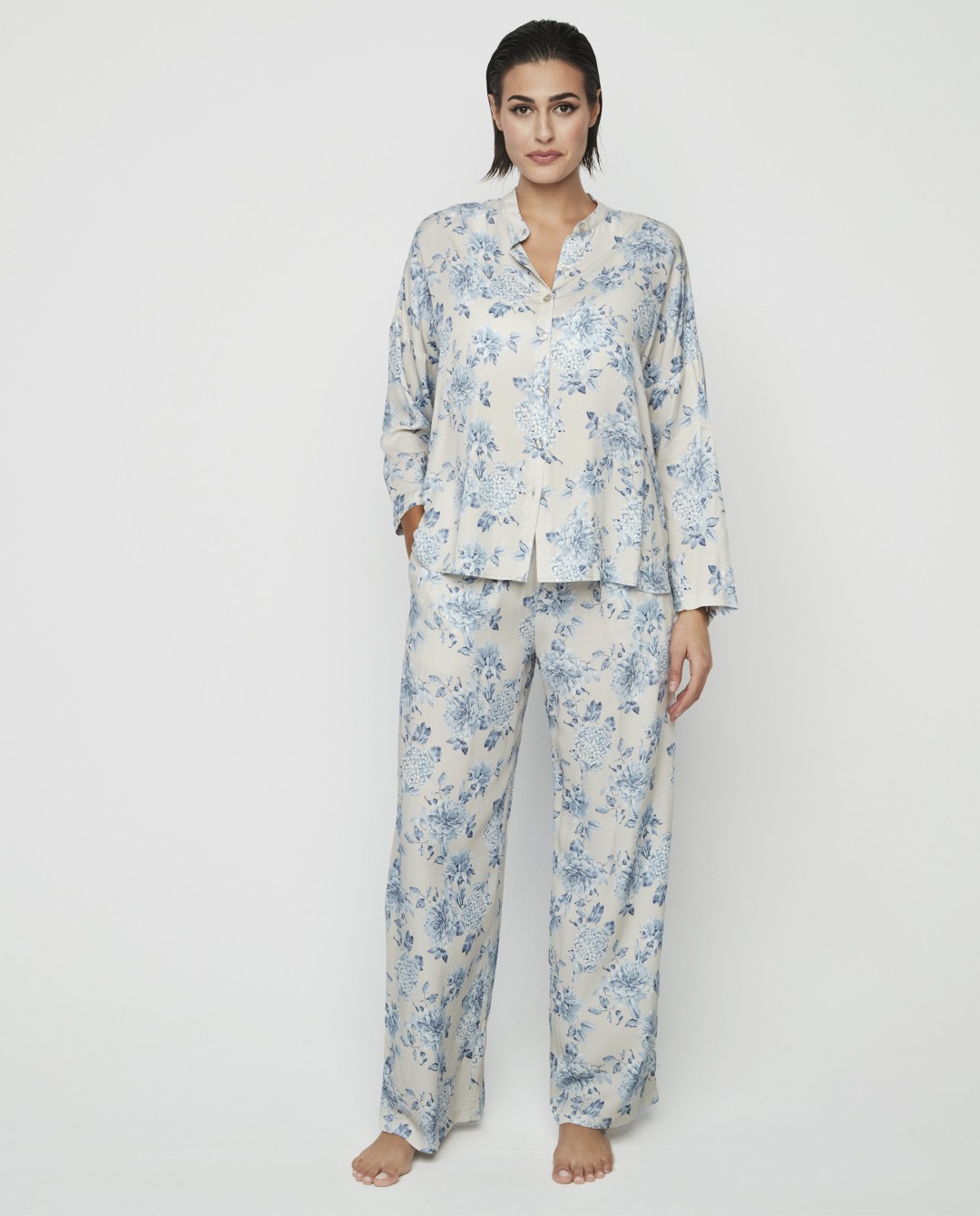 • Pijama de mujer de dos piezas. Con parte superior estilo camisa y botones al frente; la parte inferior, pantalón largo de corte clásico. Su estampado floral delicado, en tonos pastel, aporta un toque romántico y elegante, ideal para envolver noches de confort y sutileza.