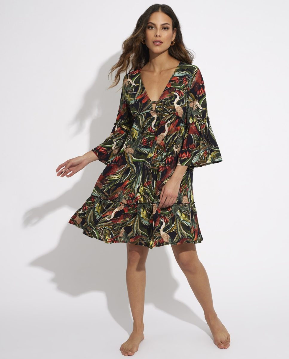 • Vestido corto con mangas. Este espectacular diseño con tonos vibrantes inspirado en la flora y fauna salvaje refleja la exuberancia y vitalidad de la naturaleza salvaje tropical. Ideal para llevar a juego con tu bikini o bañador.