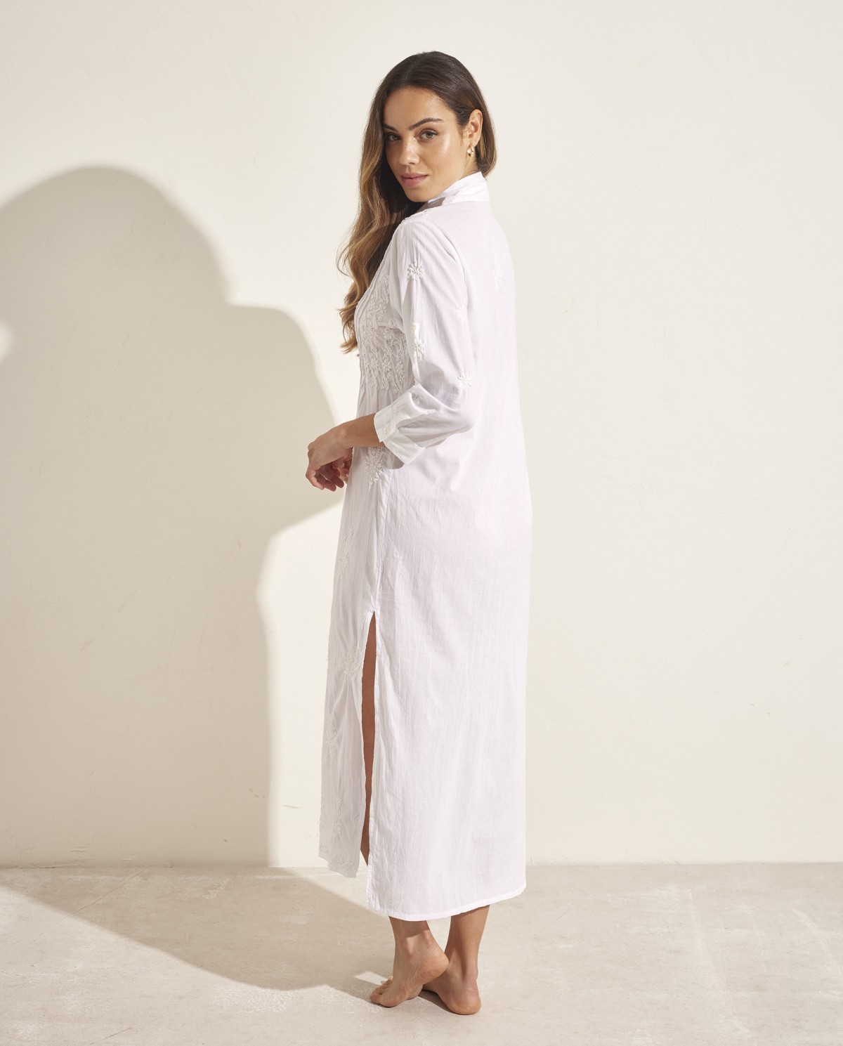 • Vestido largo tipo camisa con botones en la parte frontal. Una prenda sumamente versátil con un delicado bordado que aporta un toque femenino y juvenil.